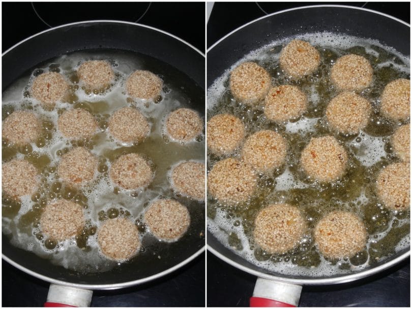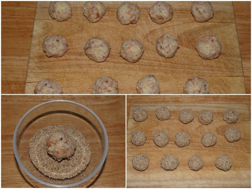 Formate da questo composto delle polpettine di salmone grandi quanto una noce aiutandovi con le mani un po' umide e passatele nei semi di sesamo.