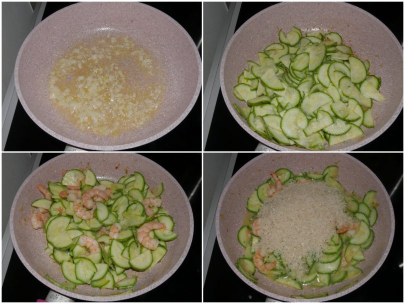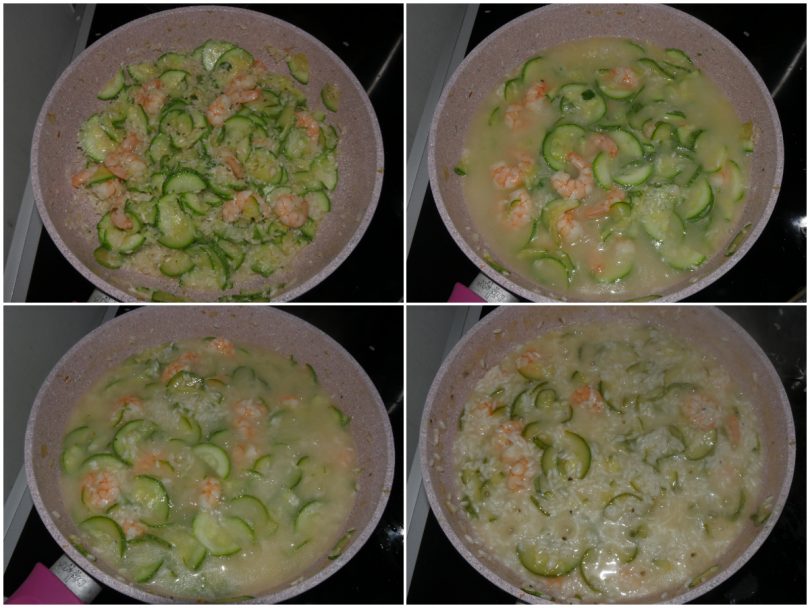Fate cuocere per 5 minuti circa, quindi aggiungete i gamberi, aggiustate di sale e di pepe e cuocete il risotto zucchine e gamberi finché il riso non sarà pronto.