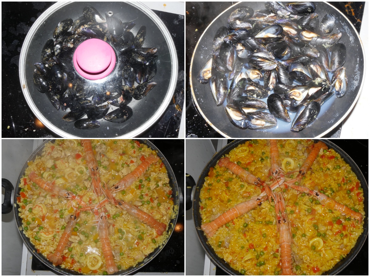 In ultimo fate aprire le cozze poi posizionate gli scampi crudi sulla paella e fate cuocere in forno o sul fornello coperto da carta stagliola per circa 10 minuti per far asciugare bene il riso e cuocere gli scampi.
