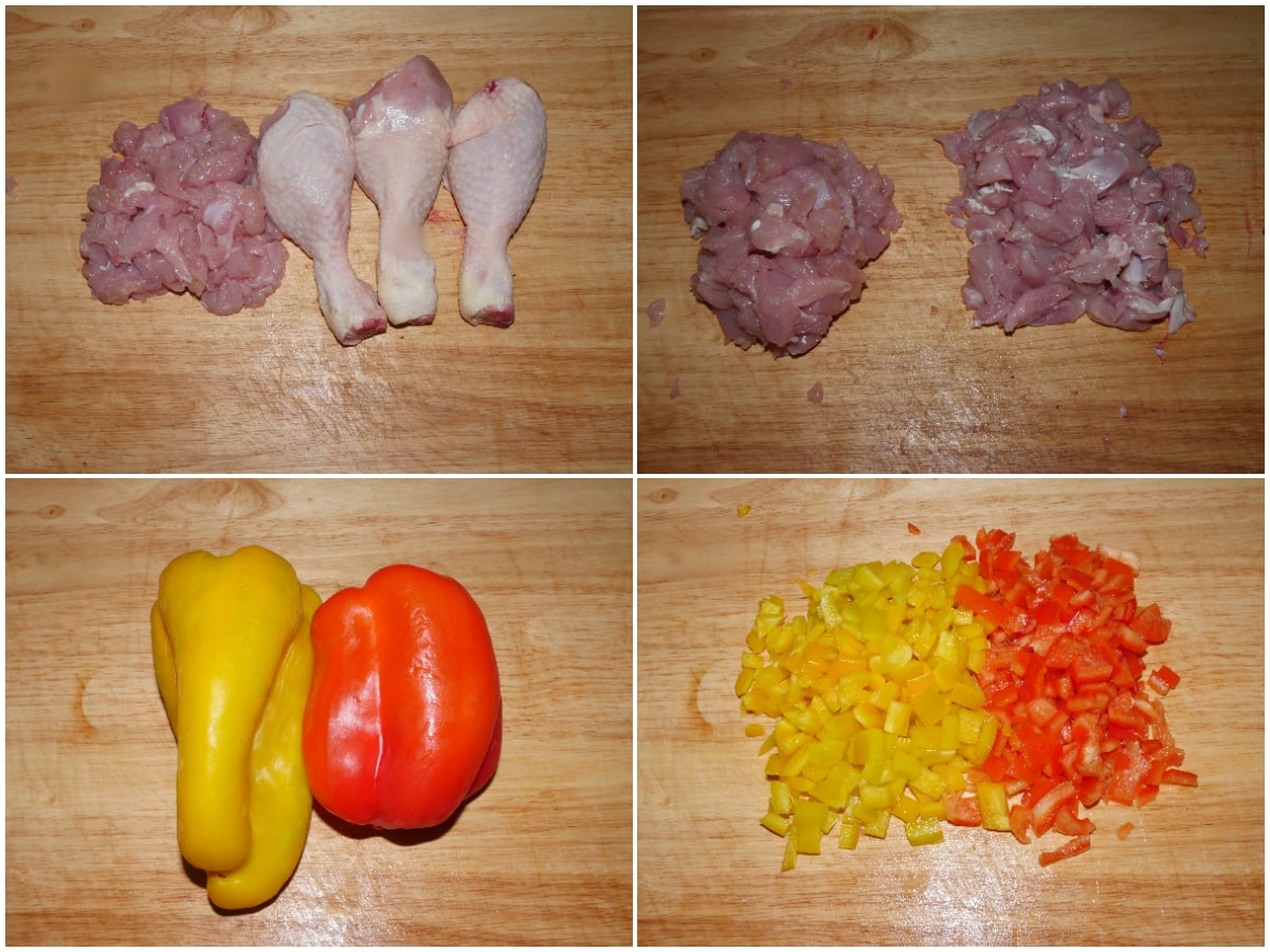Poi pulite e tagliate i peperoni a cubetti e tritate la cipolla.