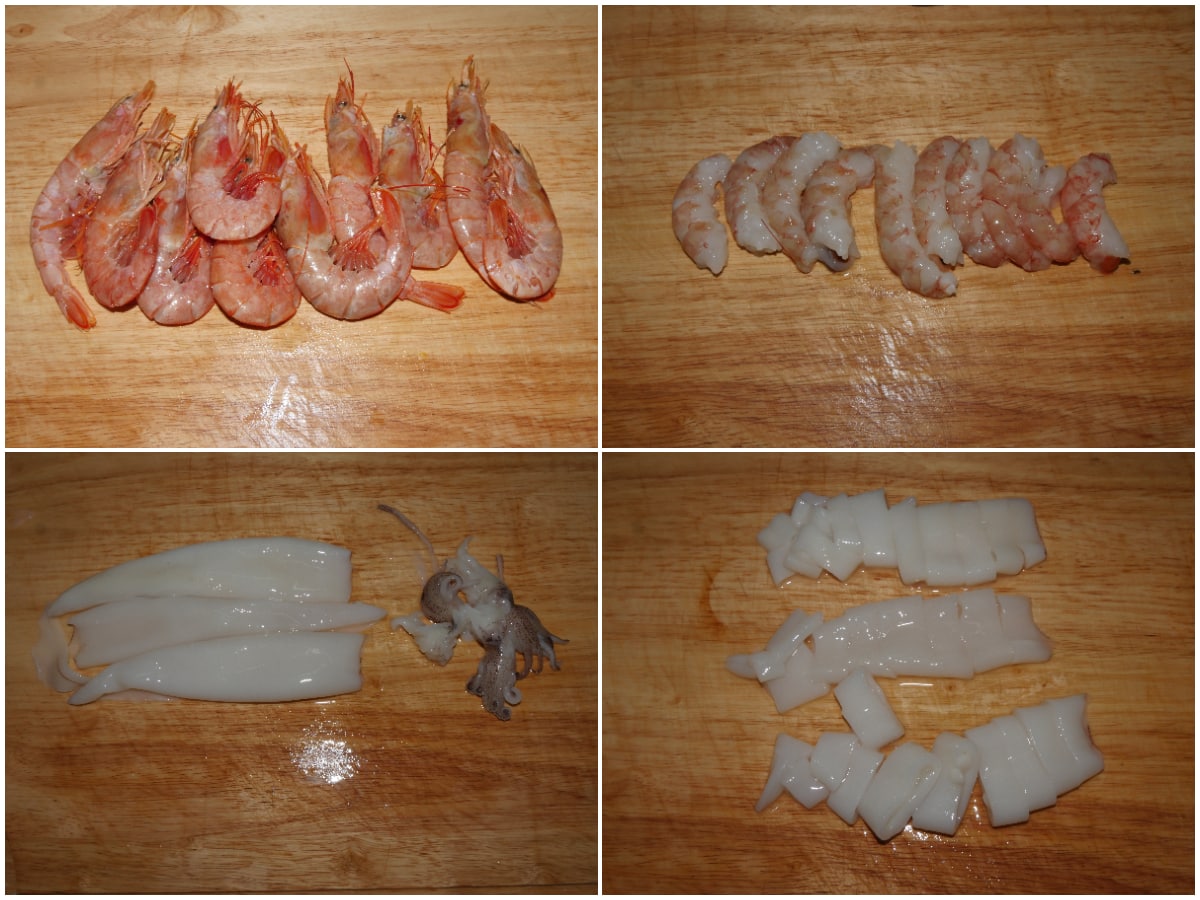 Passate ora al pesce. Pulite i gamberi eliminando testa e carapaci, pulite i calamari e tagliateli ad anelli