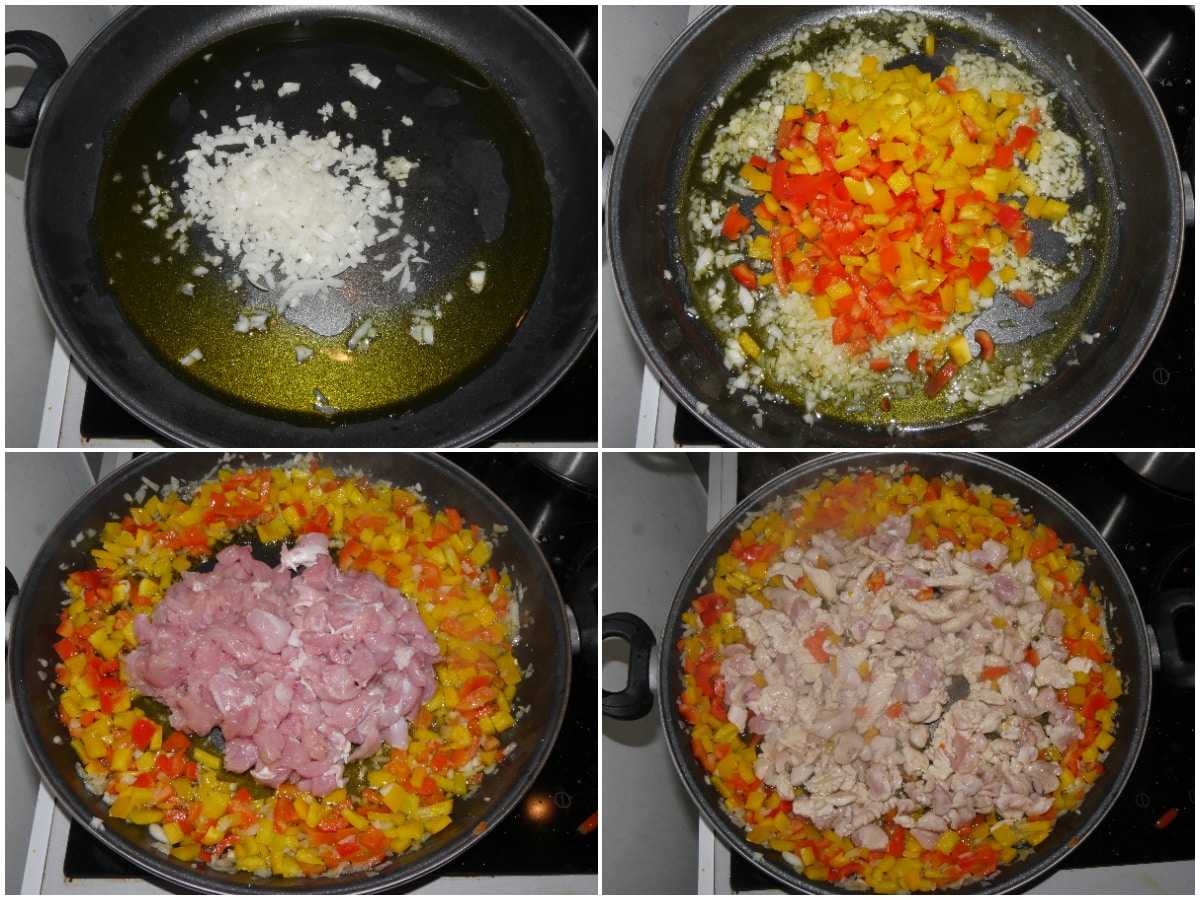 Mettete nella paellera l'olio e la cipolla tritata e fate stufare, poi aggiungete i peperoni, mescolate e fate rosolare per 5 minuti circa.