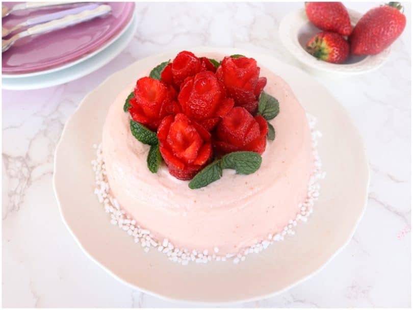 Decorate la superficie della bavarese come preferite, io ho usato delle fragole intere tagliate a mò di rosa quindi servite.