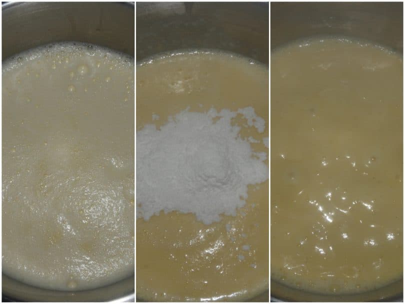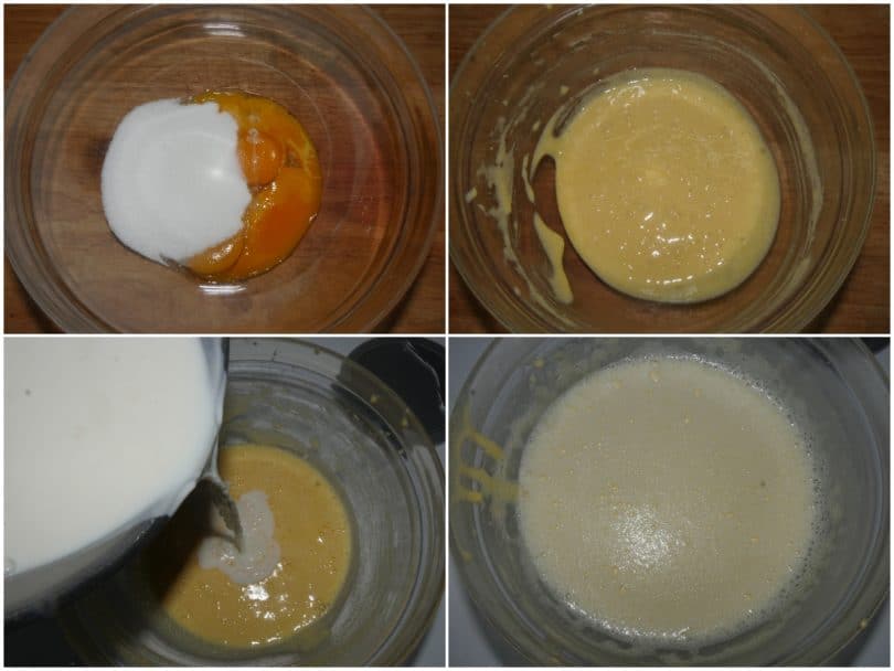Dopo aver sollevato la scorza di limone, aggiungere il latte a filo sulle uova montate e mettere il composto sul fuoco e mescolate