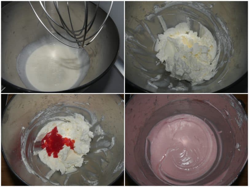 Montare la panna in una terrina poi unite la purea di fragole e mescolate fino ad ottenere una crema omogenea.