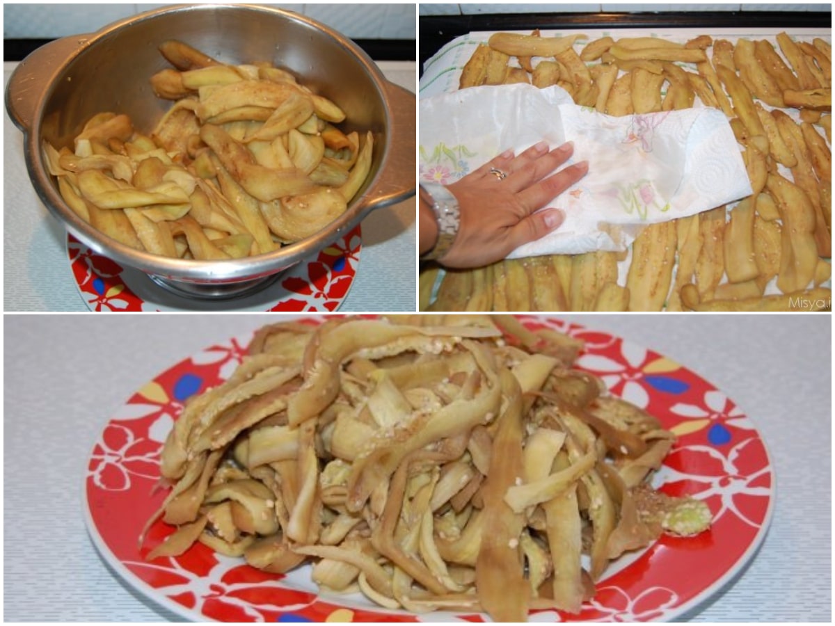 Mettete poi le melanzane ad asciugare su un canovaccio pulito e tamponare con della carta assorbente