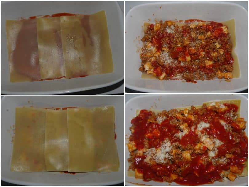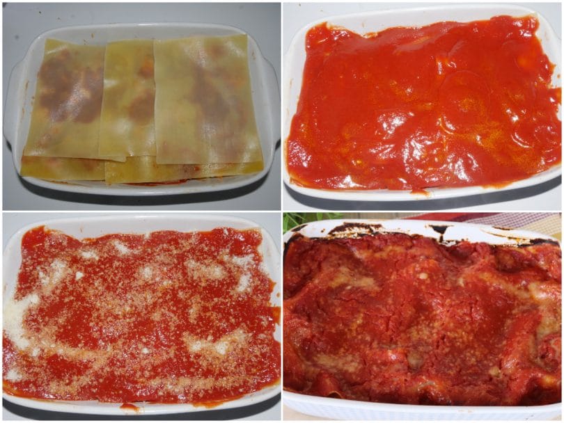 Prendete una teglia a forma rettangolare ponete sul fondo qualche mestolo di ragù e fate un primo strato di lasagne sovrapponendone i bordi.