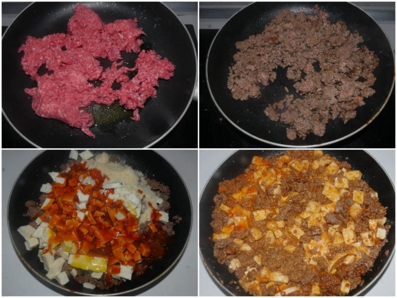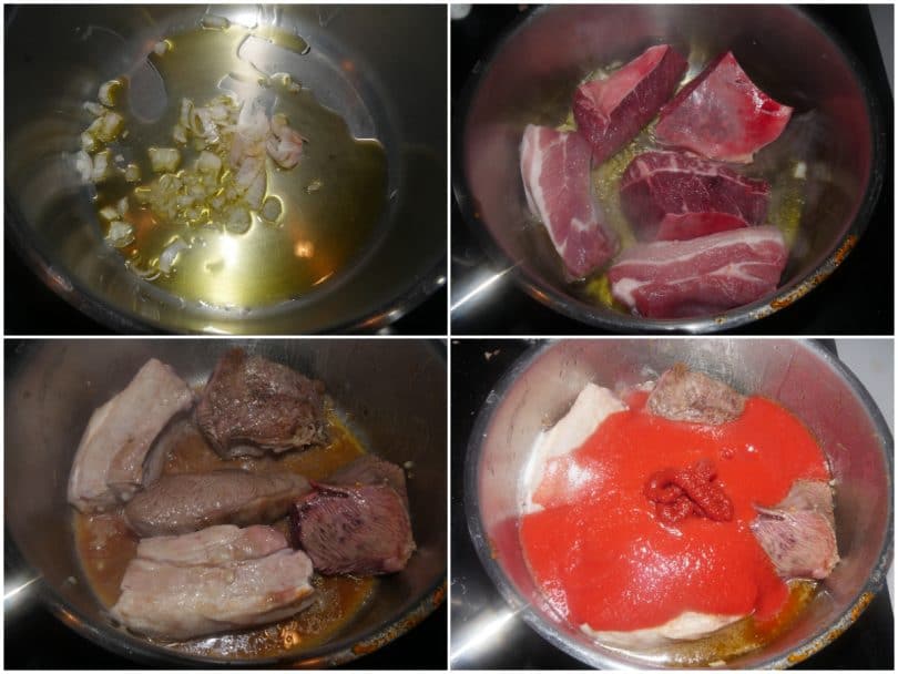 Innanzitutto preparate un ragù di carne facendo rosolare la carne di maiale tagliata a tocchetti in una pentola con dell'olio e la cipolla tritata. Poi sfumate con il vino rosso. Aggiungete la passata di pomodoro, il concentrato salate.