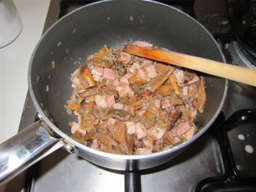 In un tegame far sciogliere il burro e far rosolare lo scalogno tritato. Aggiungere i funghi e il prosciutto e far saltare per qualche minuto.