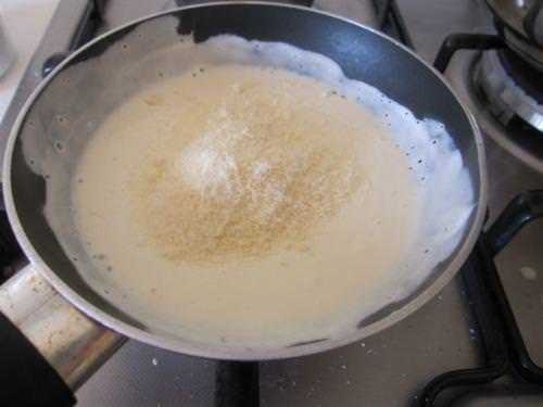 Nel frattempo preparare la fonduta di grana mescolando la panna e il latte e successivamente aggiungendo la grana grattugiata e un pizzico di noce moscata.