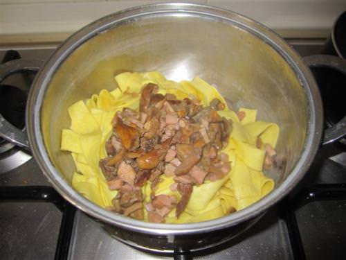 Cuocere le pappardelle in abbondante acqua salata, quindi scolarle e mescolarle insieme al condimento di funghi porcini e prosciutto.