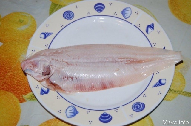 Pulite la sogliola eliminando la pinna della coda e con delle forbici, tagliare le pinne del dorso e quelle del ventre.