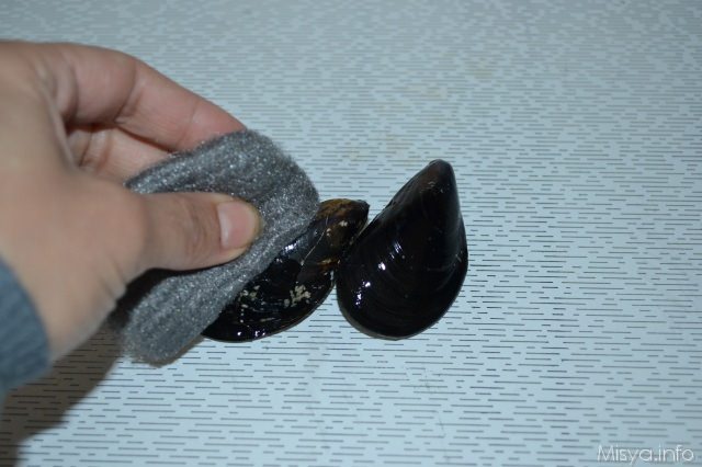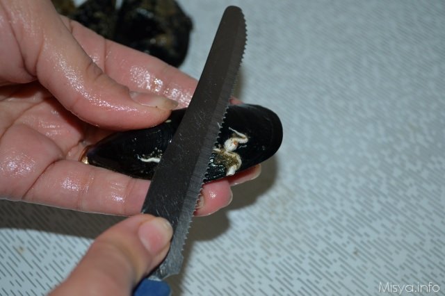 Eliminate il filamento che esce dal lato della cozza (bisso) tirandolo via con le mani