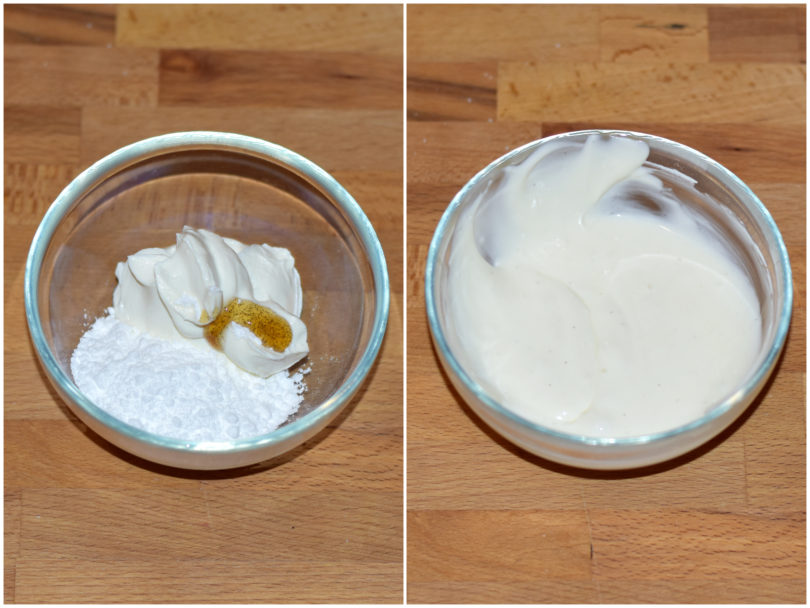Preparate il ripieno al formaggio, montando semplciemente quest'ultimo con zucchero e vaniglia fino ad ottenere una crema liscia.