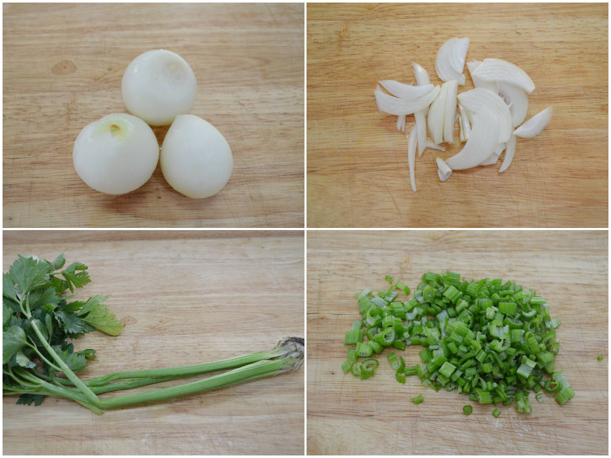 Innanzitutto pelate le cipolle e tagliatele a fettine sottili, quindi sminuzzate il sedano.
