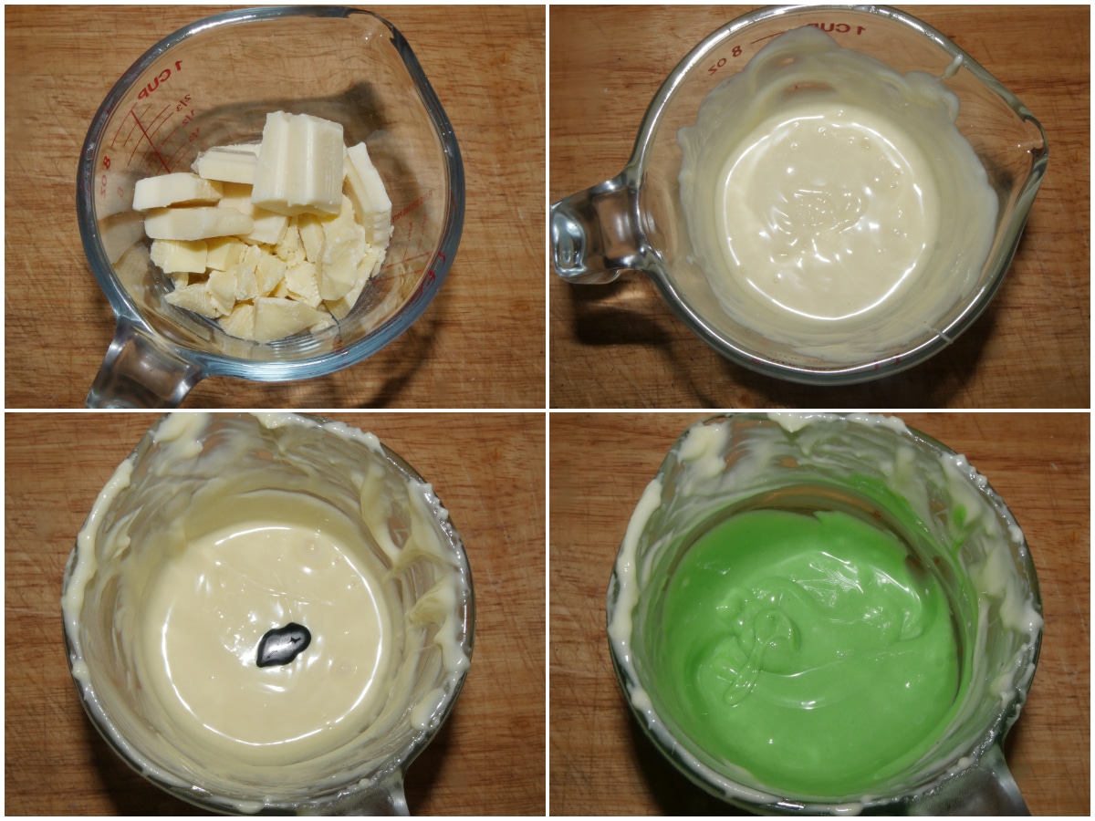 Spezzettate il cioccolato e scioglietelo in microonde (o a bagnomaria), quindi metteteci dentro il colorante verde e mescolate fino ad ottenere un colore uniforme.