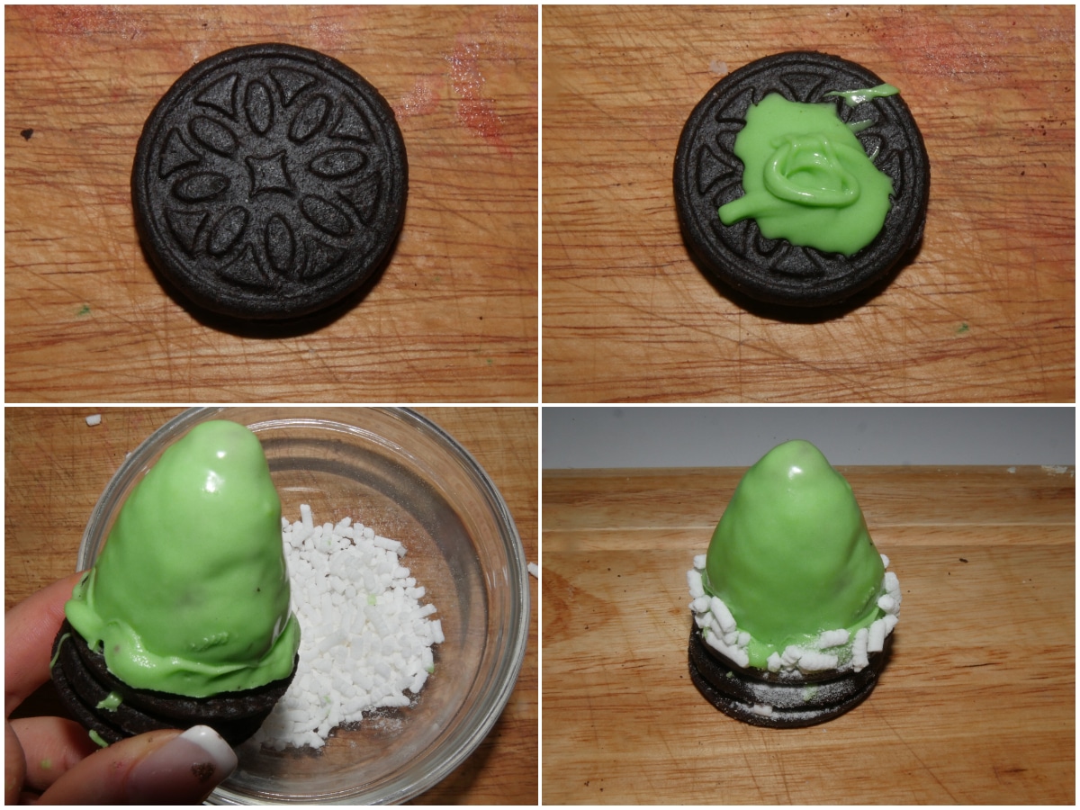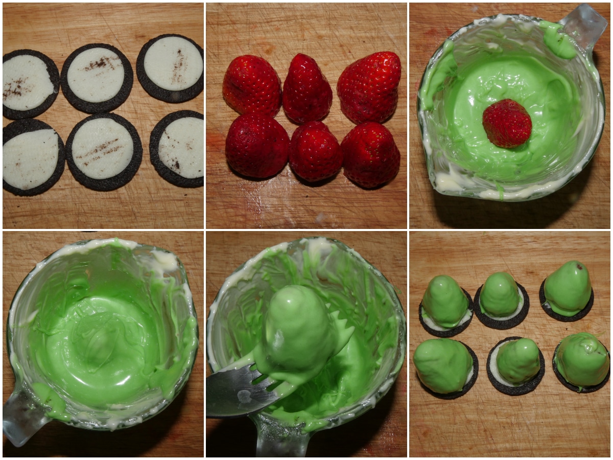 Ora avete 2 possibilità: se volete una base più alta per i vostri alberelli, aprite metà dei biscotti Oreo, immergete le fragole nel cioccolato ricoprendole per intero, quindi poggiatele sui biscottini, infine usate dell'altro cioccolato fuso per incollarci sotto un secondo biscottino intero.