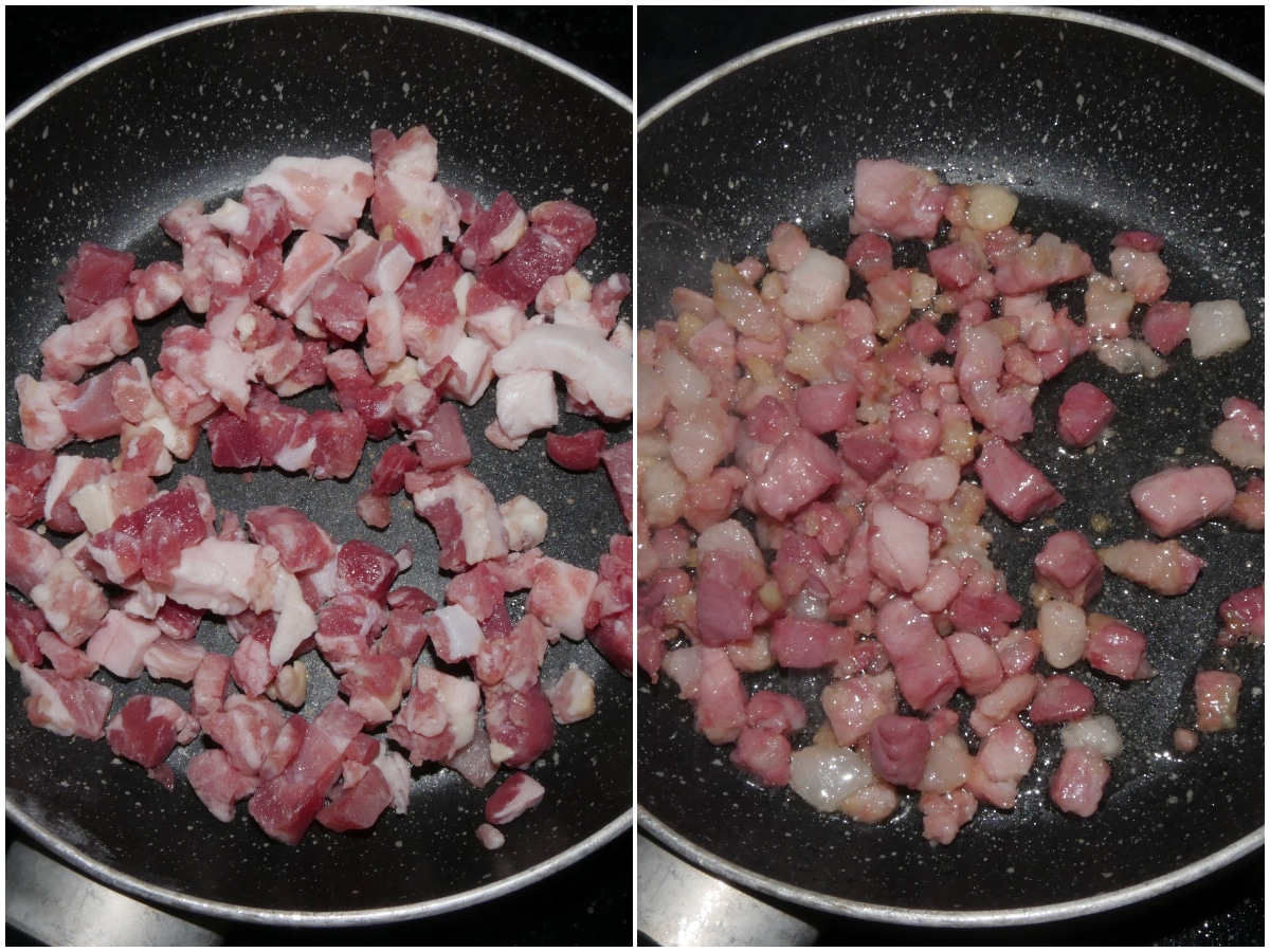 Innanzitutto cuocete la pancetta in una padella antiaderente (senza aggiungere olio o altri grassi) fino a farla dorare leggermente.