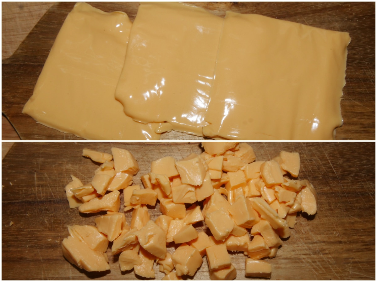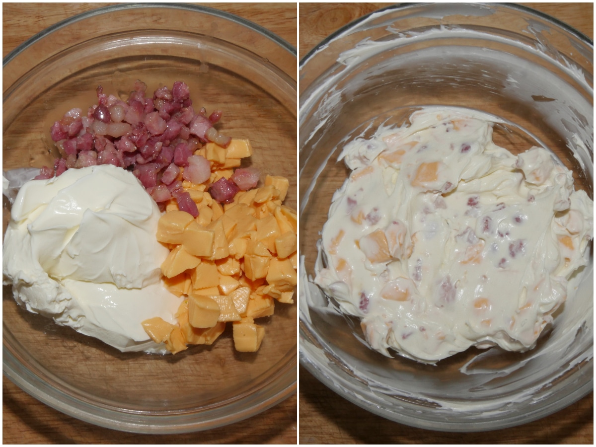 Unite in una ciotola Philadelphia, cheddar e pancetta, condite a piacere con sale e pepe (attenti a non esagerare) e amalgamate.