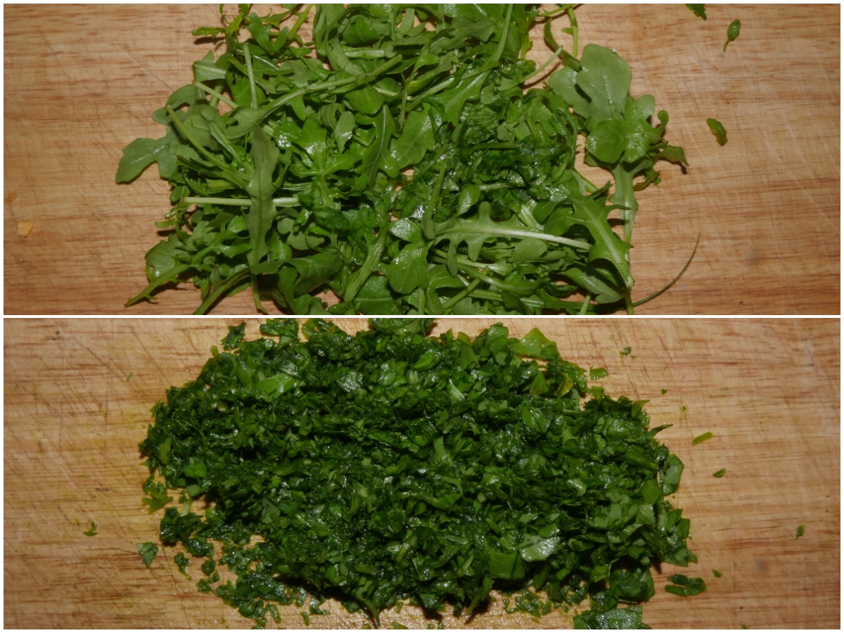 Con un cucchiaino o una sac-à-poche, create dei coni rovesciati di composto di formaggio sui crackers, quindi, con un po' di delicatezza, cospargeteli uniformemente con la rucola, facendola aderire bene.