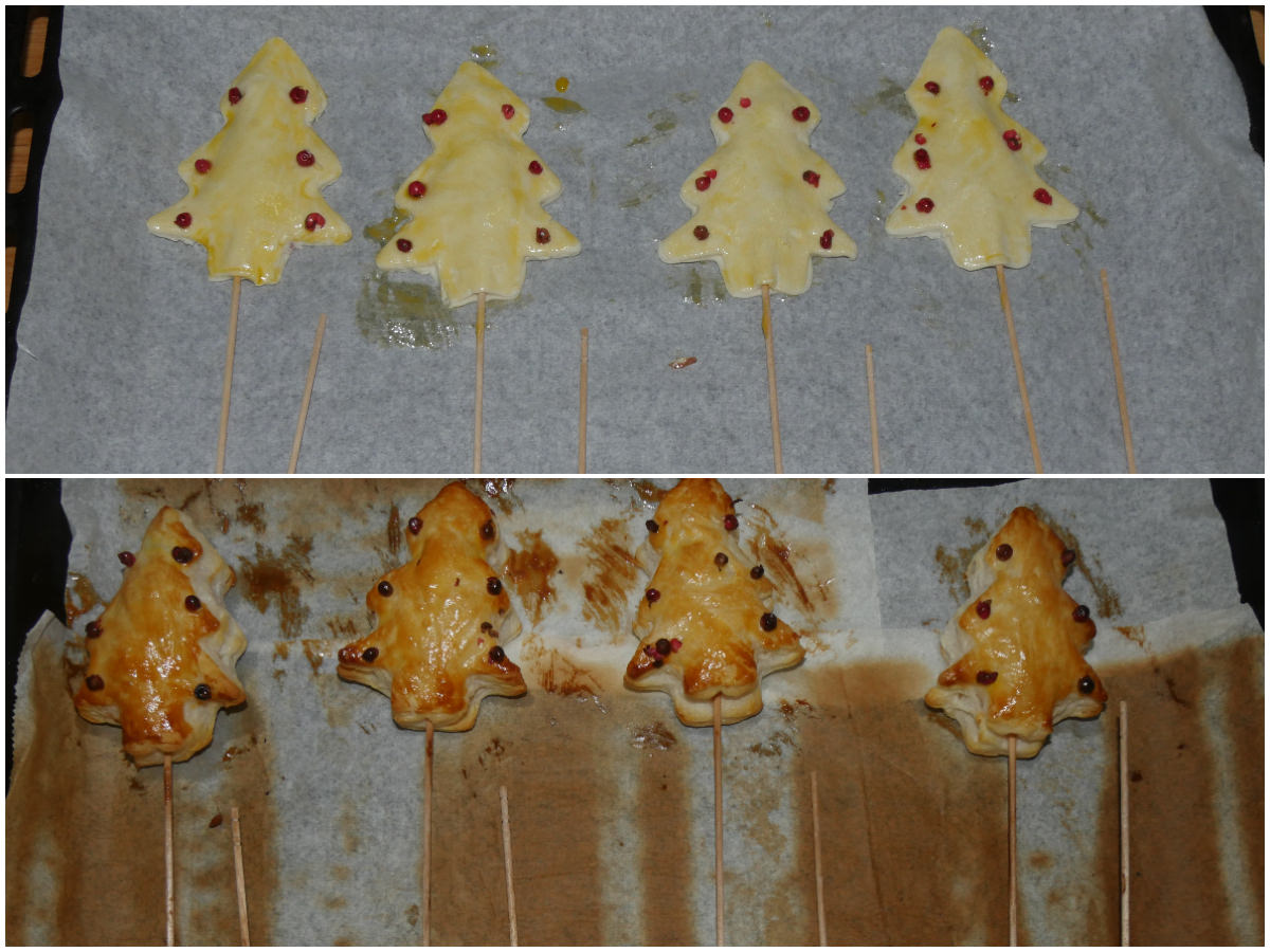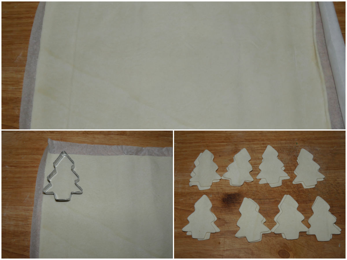 Stendete la pasta sfoglia sul piano di lavoro e ritagliate gli alberelli con la formina (dovranno essere in numero pari, in modo da poterli abbinare a due a due).
