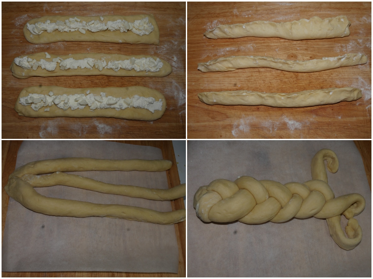 Stendete i 3 pezzi per ricavare 3 strisce appiattite, lunghe 40 cm circa, farcite con la crema di ricotta e richiudete intorno al ripieno, sigillando bene i bordi, quindi intrecciateli per formare il tronco, stando attenti a mantenere la parte con la chiusura verso il basso.