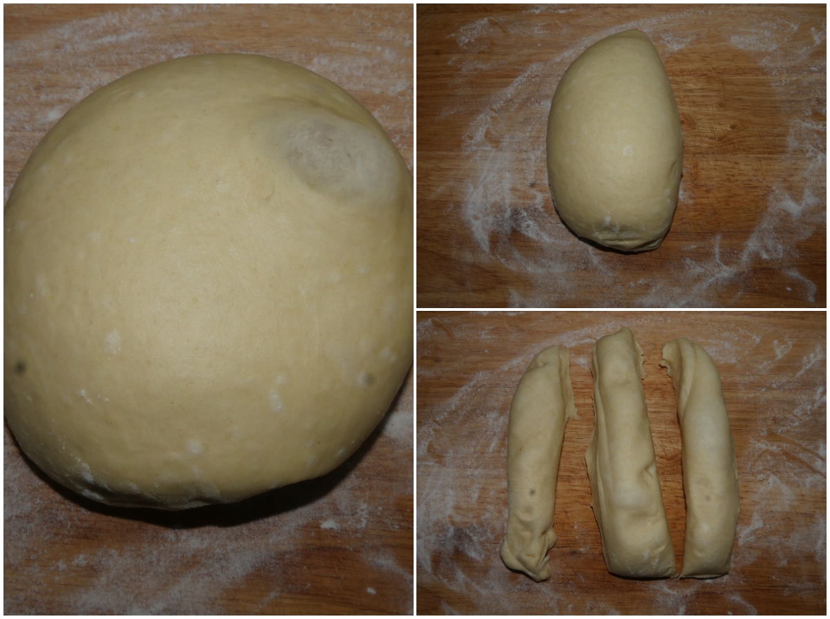 Riprendete l'impasto, sgonfiatelo con le mani e dividetelo: con la metà più grande create 3 filoncini uguali.