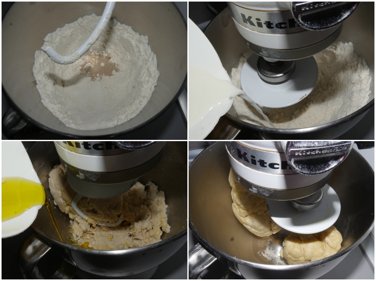 Unite farine, zucchero e lievito in una ciotola, unite il latte poco per volta e poi anche olio, sale e uovo, e lavorate fino ad ottenere un panetto elastico.