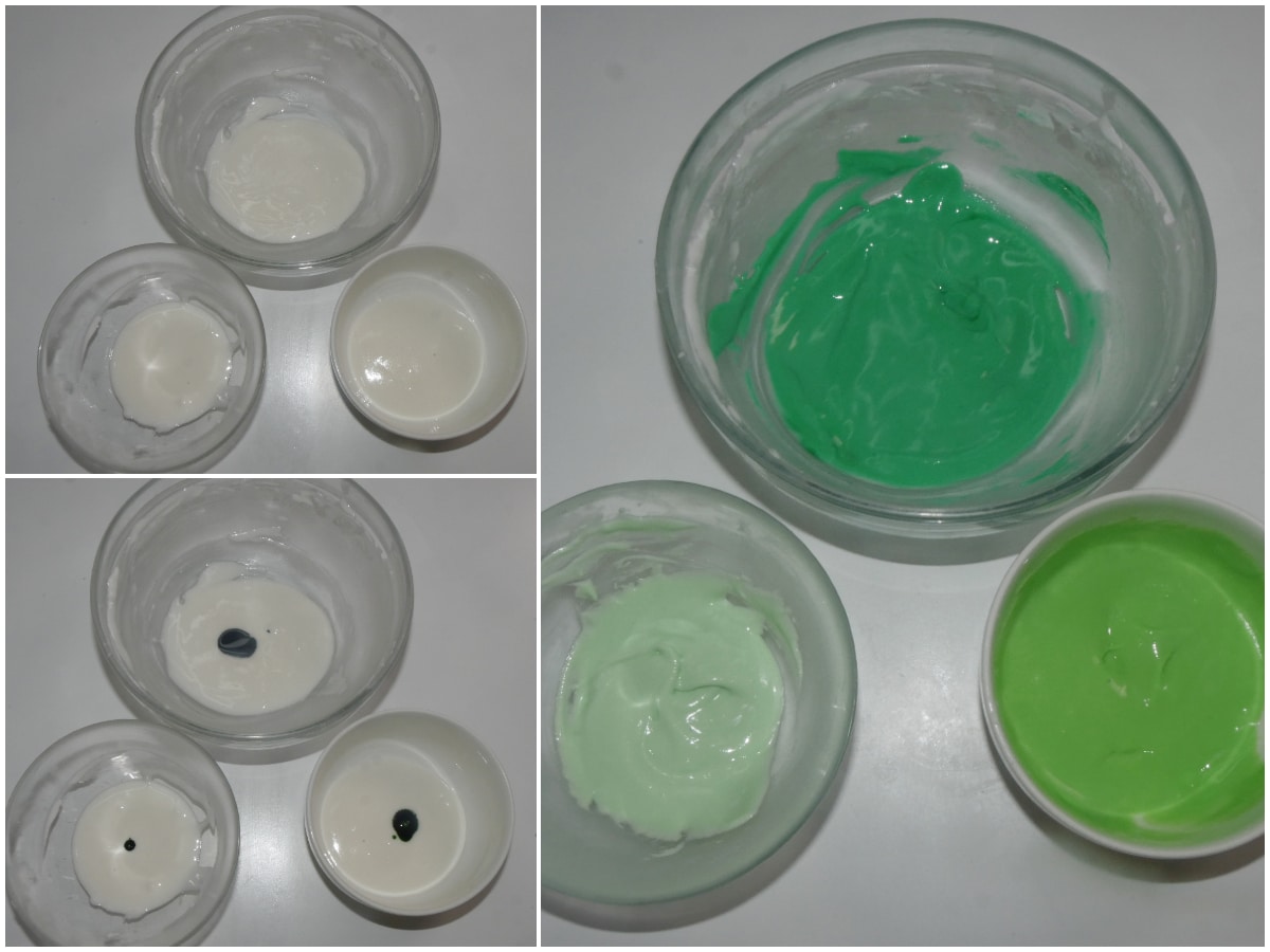 Dividete la glassa in 3-4 ciotoline (io ne ho lasciata una piccola parte bianca) e aggiungete una dose diversa di colorante in ognuna, in modo da trovarvi sfumature diverse di verde.