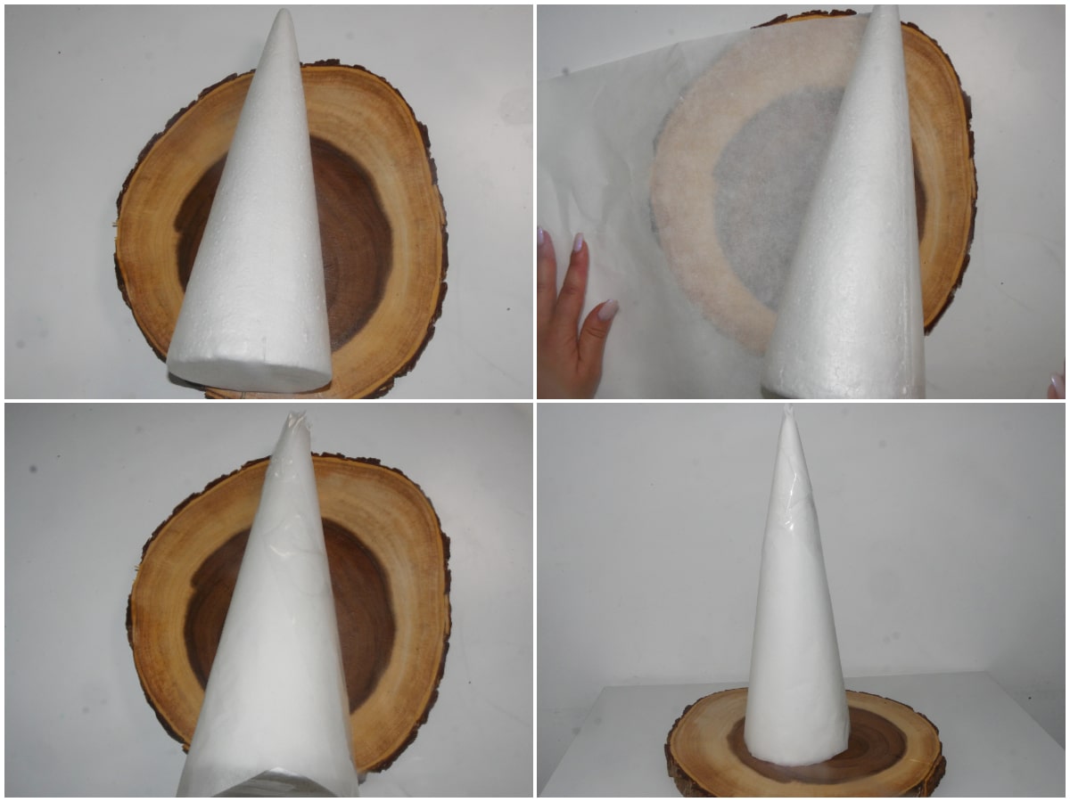 Rivestite il vostro cono di polistirolo con carta forno, facendola aderire bene e cercando di attaccarla bene con il nastro adesivo sotto la base, in modo che non si sfili.