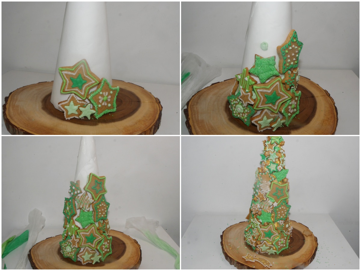 A questo punto potete iniziare a decorare il cono, cercando di incastrare per quanto possibile le stelle tra di loro, usando le più grandi soprattutto sulla base e utilizzando la glassa come collante.