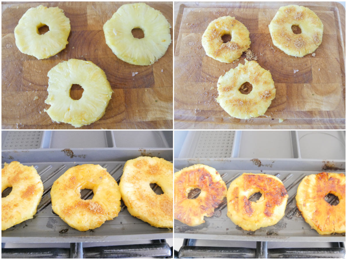 Fate scaldare per bene una piastra o bistecchiera a fiamma alta, e nel frattempo eliminate il torso centrale dalle fette di ananas e cospargetele di zucchero di canna.