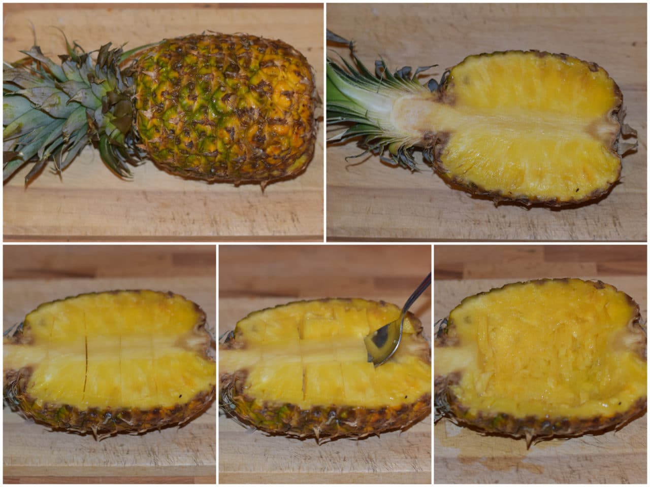 Tagliate la polpa del mezzo ananas a quadrotti e scavatela via con un cucchiaio, mettendo la polpa da parte.