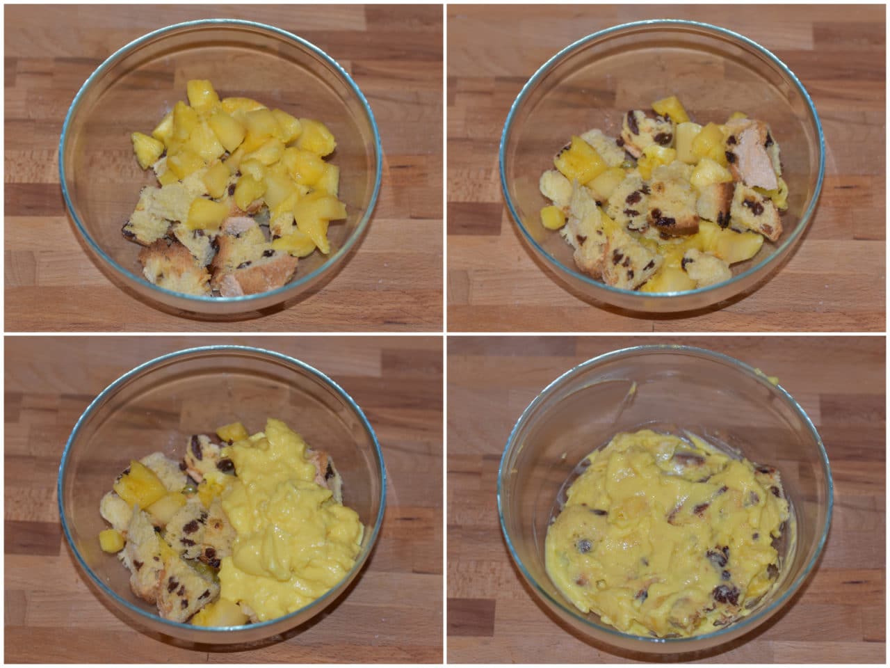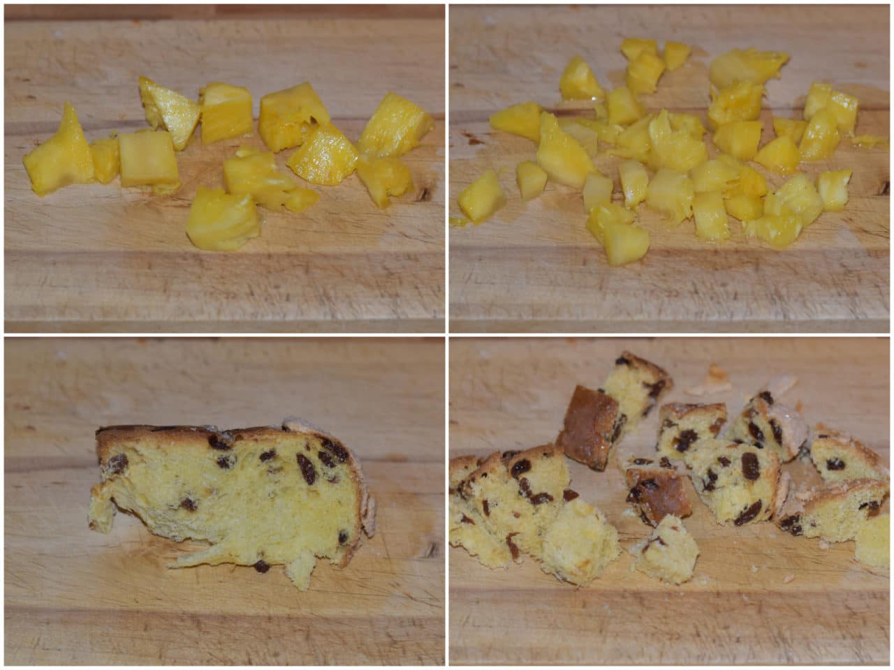 Tagliate ananas e panettone a quadratini, quindi uniteli in una ciotola anche con la crema e amalgamate.