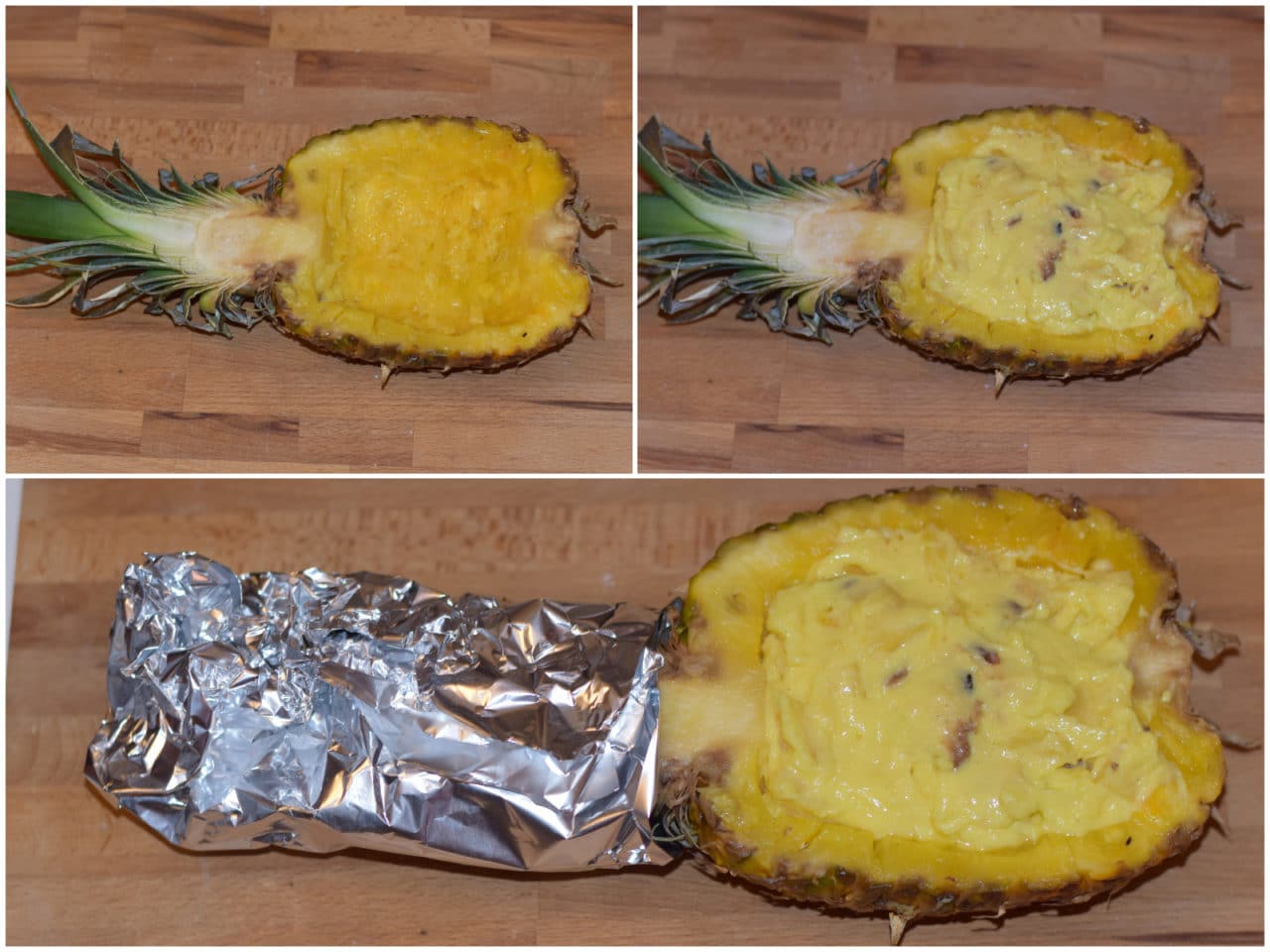 Riprendete il guscio di ananas e riempitelo con il composto di crema, poi coprite le foglie con la carta di alluminio, in modo che non brucino in forno.