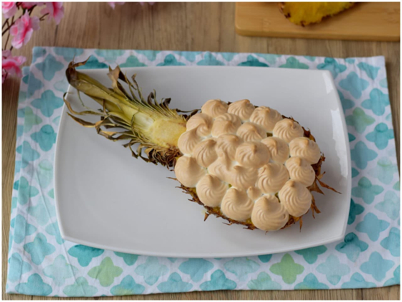 L'ananas meringato è un dessert scenografico, ma che nasconde anche una sorpresa. Sì, perché i vostri ospiti vi vedranno portare in tavola un bellissimo mezzo ananas ricoperto di meringhe, ma quello che non sanno è che al suo interno sarà celato un cuore cremosissimo e goloso. Se aggiungo anche che potete sfruttare questo ananas meringato come idea riciclo per consumare del panettone avanzato vi convinco a provarlo? ;)