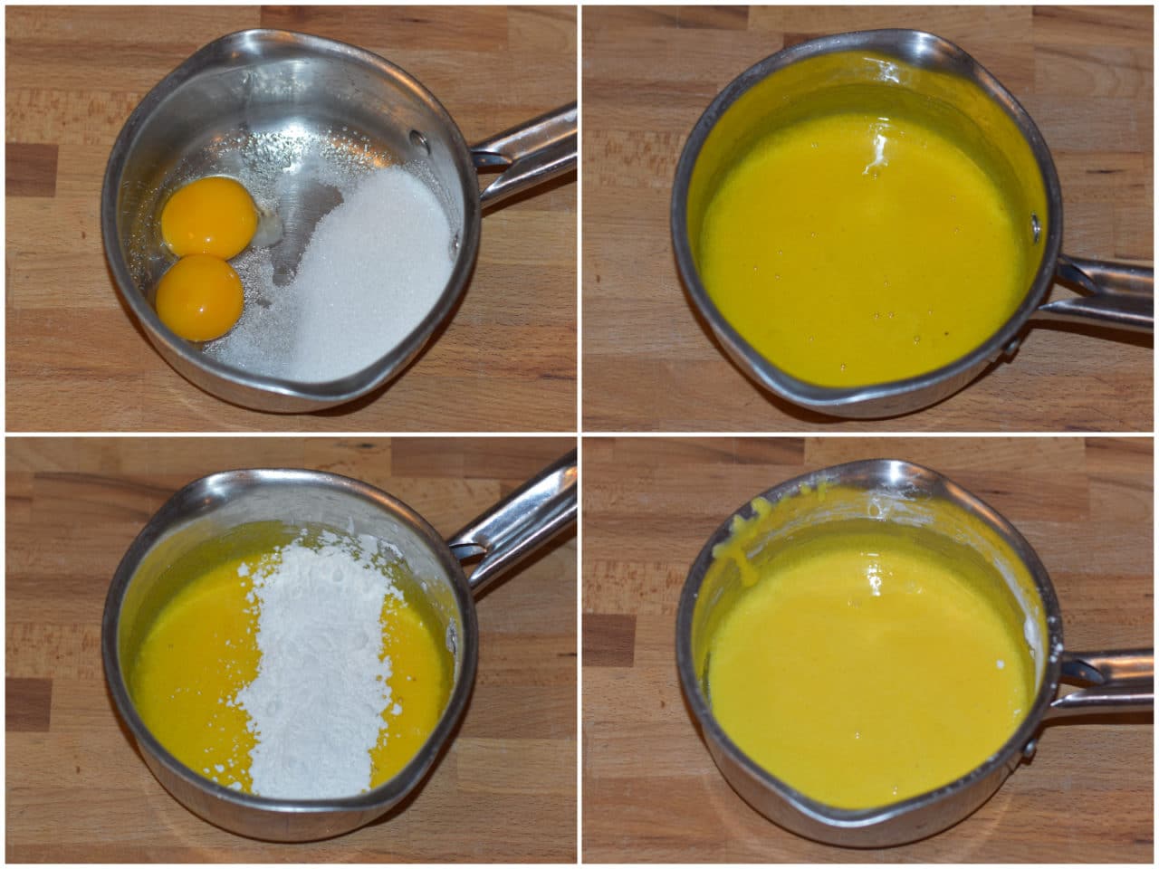 Innanzitutto separate gli albumi dai tuorli e lavorate questi ultimi con lo zucchero, quindi incorporate prima la maizena e poi il latte e la panna intiepidito insieme alla vaniglia, quindi cuocete a fiamma bassa, mescolando costantemente.
