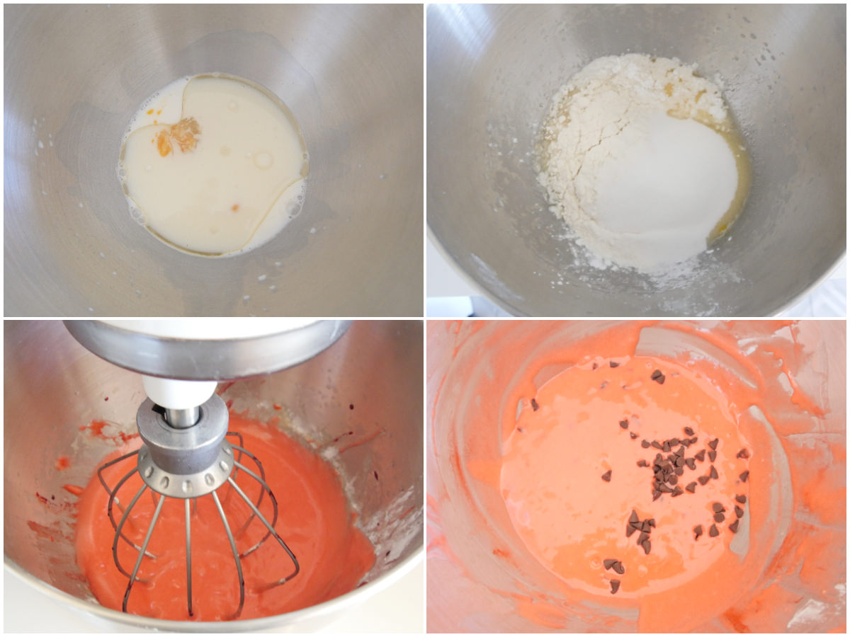 Iniziate preparando le tortine: lavorate le uova con lo zucchero, quindi incorporate prima latte e olio, poi tutti gli ingredienti secchi (farina, lievito e sale), infine aggiungete anche colorante rosso e gocce di cioccolato.