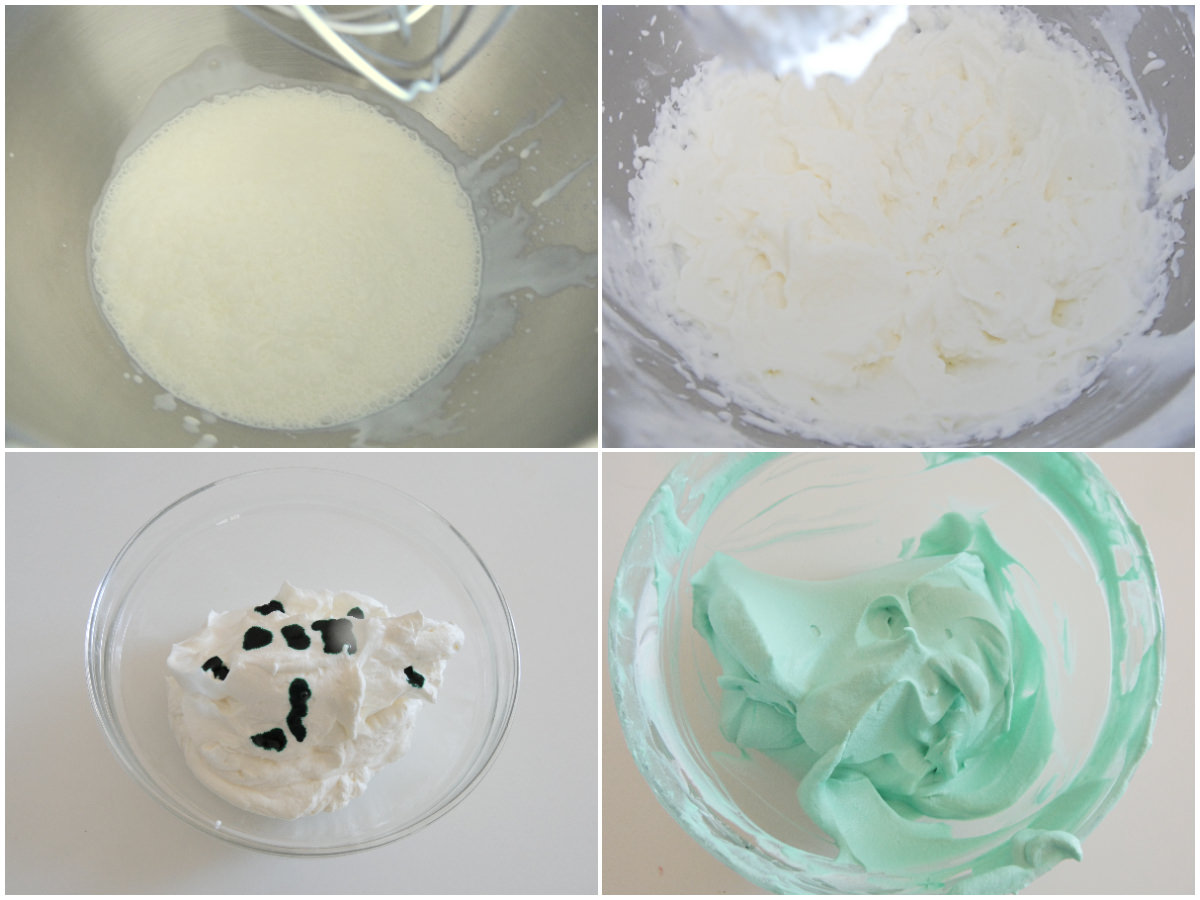 Quando le tortine saranno pronte, preparate il frosting: montate la panna ben fredda di frigo, quindi aggiungete il colorante verde e amalgamate delicatamente, in modo da non far smontare la panna.