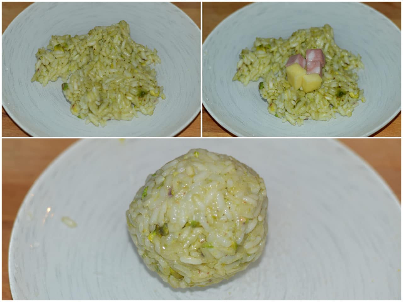 Prendete 1-2 cucchiai di riso per volta, mettete al centro qualche cubettino di scamorza e mortadella e richiudete, creando una sfera.