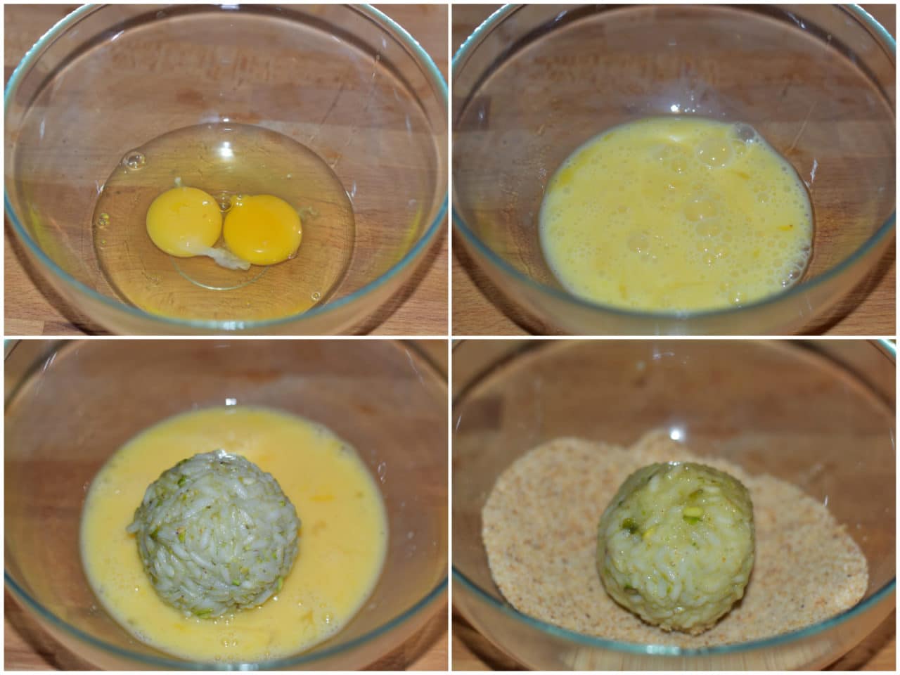 Sbattete le uova con latte e un pizzico di sale e passate gli arancini, uno per volta, prima nelle uova e poi nel pangrattato.