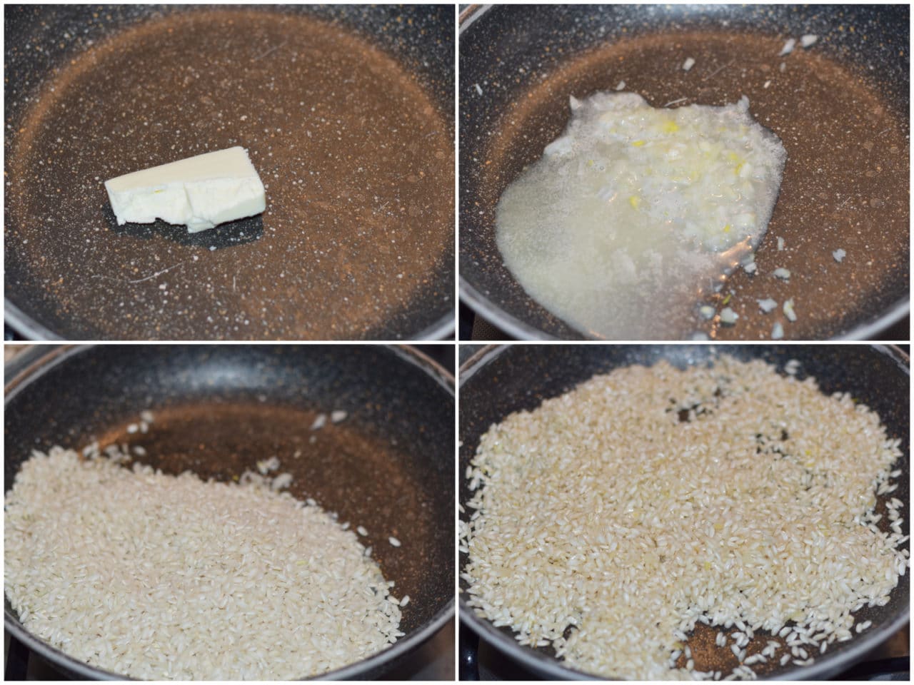 Fate dorare leggermente la cipolla tritata nel burro, quindi unite il riso e lasciatelo tostare nel condimento.