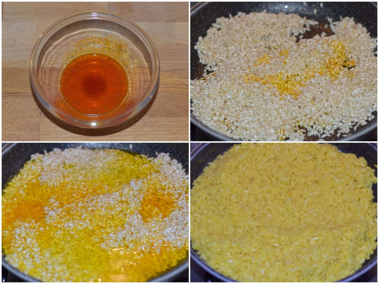 Sciogliete lo zafferano con poca acqua e unitelo al riso, quindi iniziate la cottura aggiungendo il brodo caldo poco per volta.