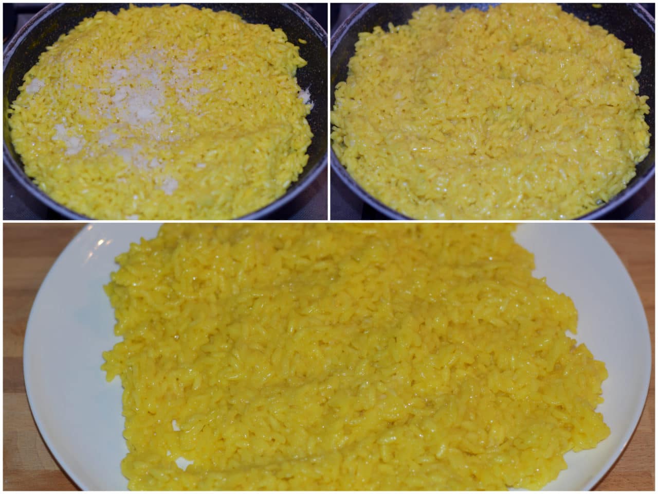 A fine cottura mantecate con il parmigiano, trasferite il riso su di un piatto ampio, stendetelo e lasciate raffreddare per bene.