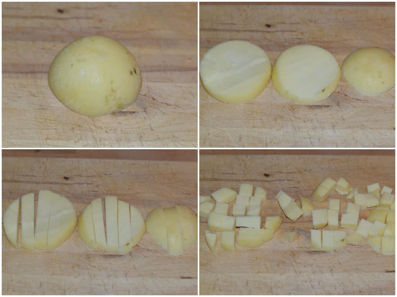Tagliate prosciutto e formaggio a dadini piccoli.