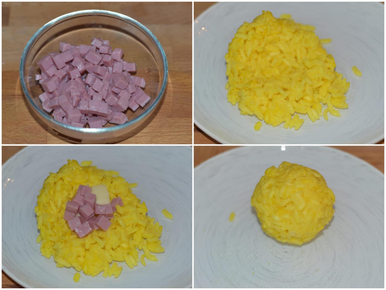 Create gli arancini, prendendo una mezza manciata di riso e mettendoci al centro un po' di prosciutto e formaggio a dadini, quindi chiudete il riso sulla farcitura, pressando bene.