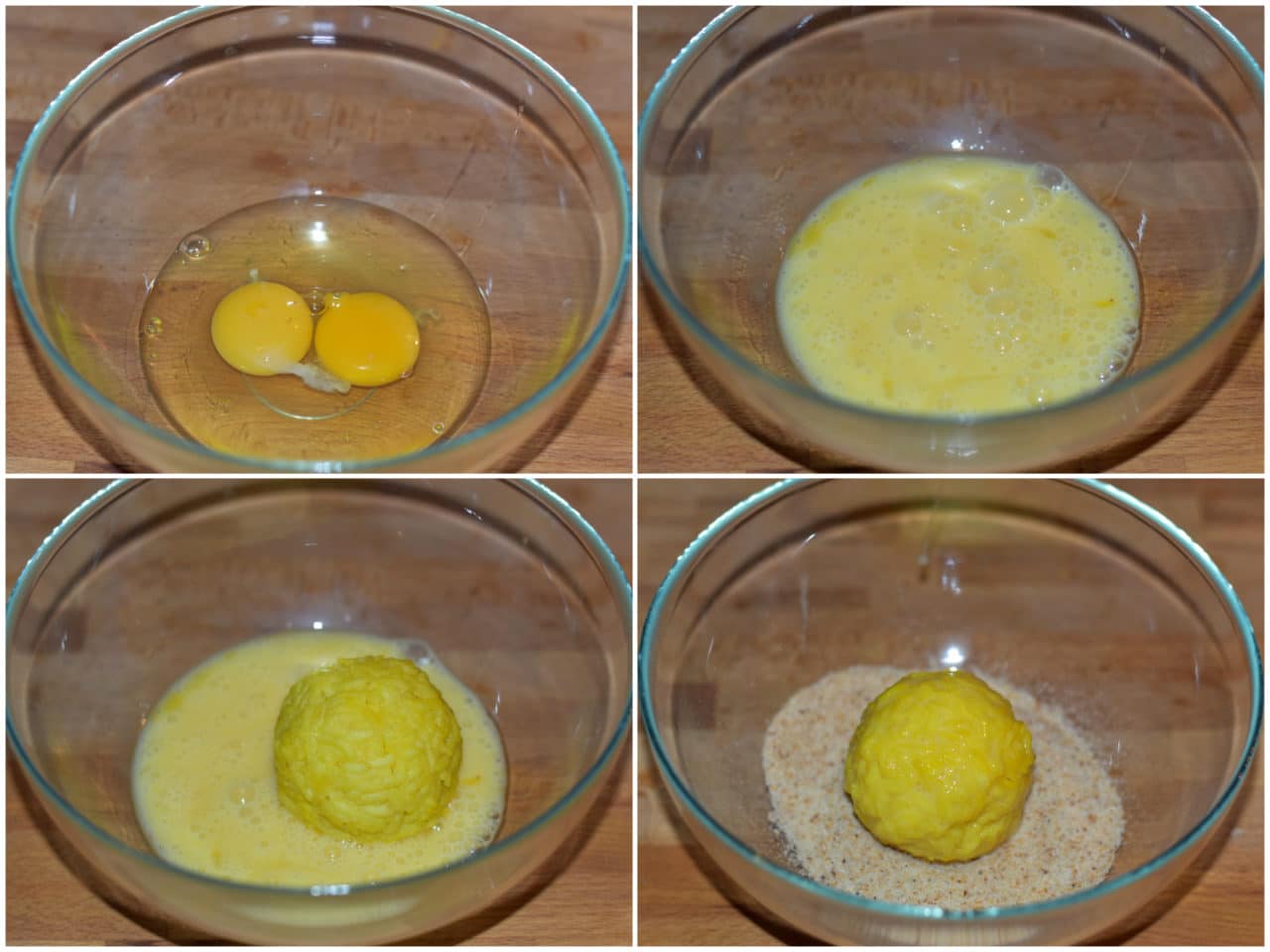 Sbattete le uova con latte e un pizzico di sale, quindi passate ogni arancino prima nelle uova e poi nel pangrattato, impanandoli in maniera uniforme.