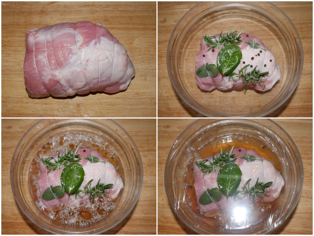 Unite in una ciotola la carne, la birra e gli aromi (infilate salvia, rosmarino e alloro sotto lo spago, poi aggiungete pepe, pepe rosa e chiodi di garofano nella ciotola), coprite la ciotola con pellicola per alimenti e lasciate riposare in frigo per una notte o per almeno 8 ore.