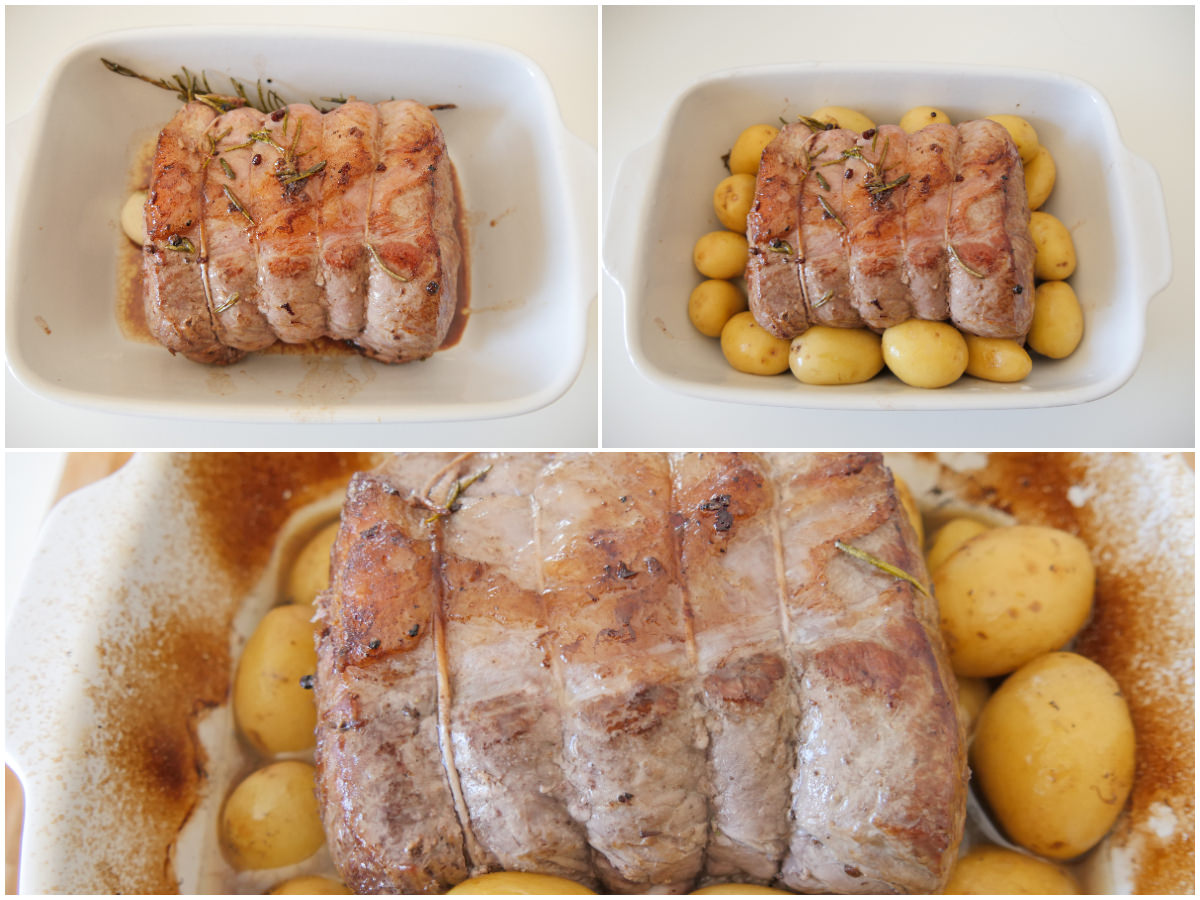 Trasferite l'arrosto, con tutti i sughi di cottura, in una pirofila adatta al forno, aggiungete le patate ben lavate (e, se volete, anche pelate), un filo d'olio, un pizzico di sale e unite il brodo.