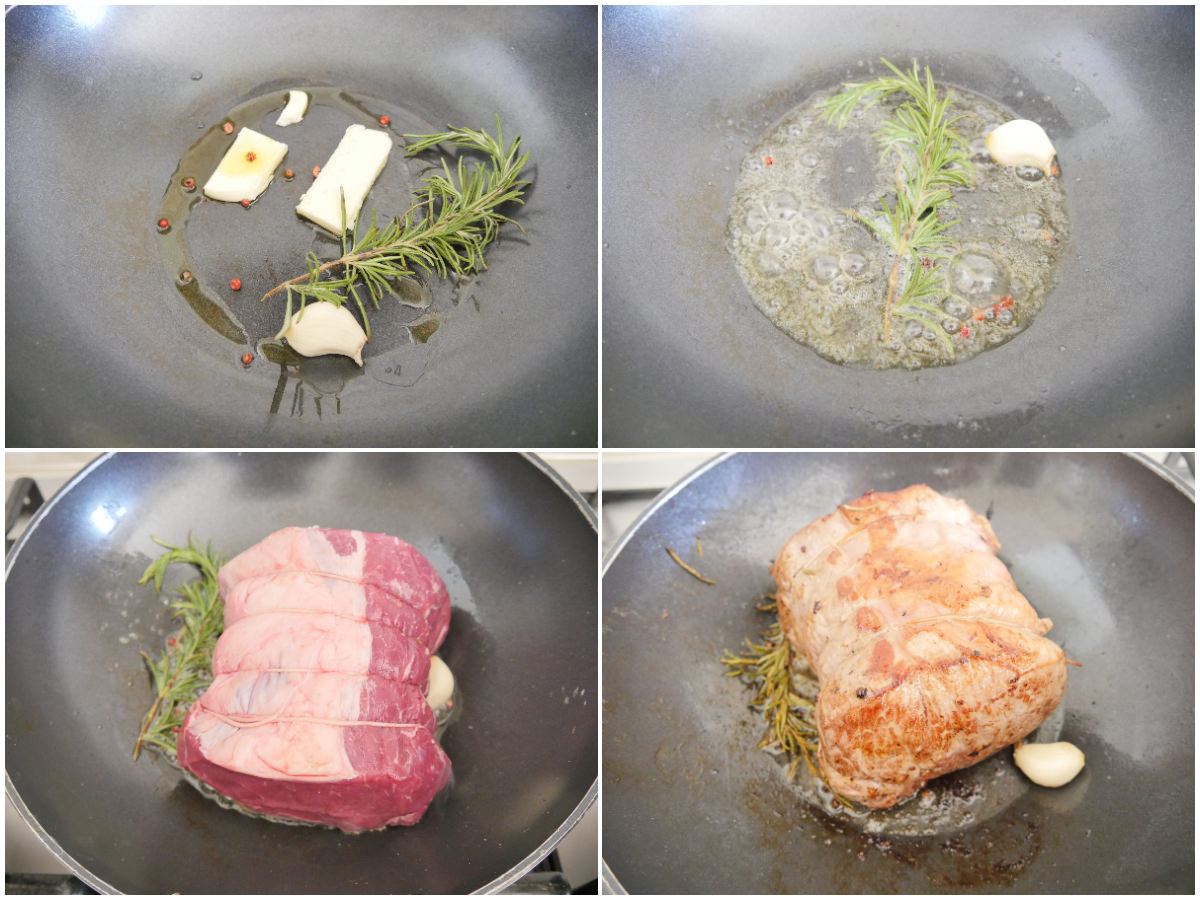 Innanzitutto fate soffriggere aglio, rosmarino e pepe in grani in una casseruola con il burro.